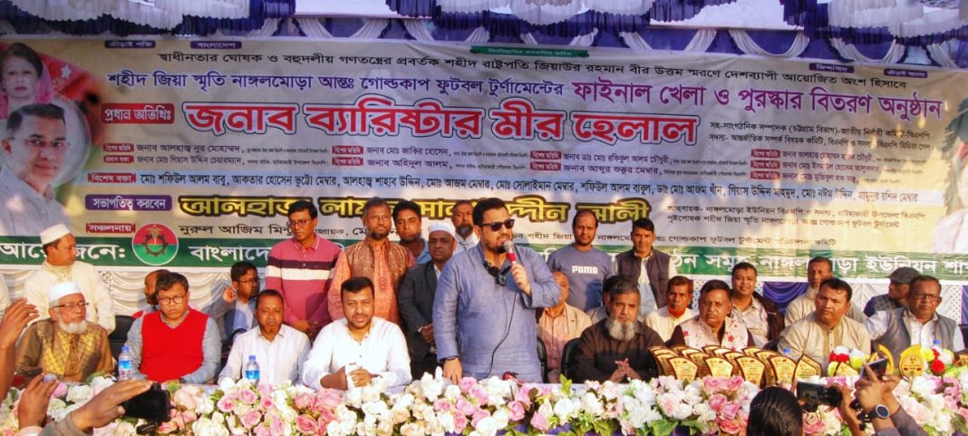 প্রধান অথিতি বক্তব্য ব্যারিষ্টার মীর হেলাল বলেন, আমরা তরুণ ও যুব সমাজের পড়ালেখার পাশাপাশি খেলাধুলায় সম্পৃক্ত করণের জন্য বাংলাদেশ জাতীয়তাবাদী দলের ভারপ্রাপ্ত চেয়ারম্যান জনাব তারেক রহমানের অনুপ্রেরণায় “শহীদ জিয়া স্মৃতি ফুটবল টুর্নামেন্ট বাস্তবায়ন করতে যাচ্ছি,তিনি আরো বলেন শিক্ষার মান বৃদ্ধি ও স্থানীয় জনগণের সম্পৃক্ততা বৃদ্ধির জন্য পড়ালেখার পাশাপাশি খেলাধুলার মাধ্যমে শিক্ষার্থীদের শারীরিক ও মানসিক বিকাশ, প্রতিযোগিতার মাধ্যমে শিক্ষার্থীদের সহিষ্ণুতা, মনোবল বৃদ্ধিসহ খেলোয়াড় সুলভ মনোভাব গড়ে তোলার জন্য সমাজের সকল পর্যায়ে জনগনকে এগিয়ে আসার জন্য অনুরোধ জানাচ্ছি।
