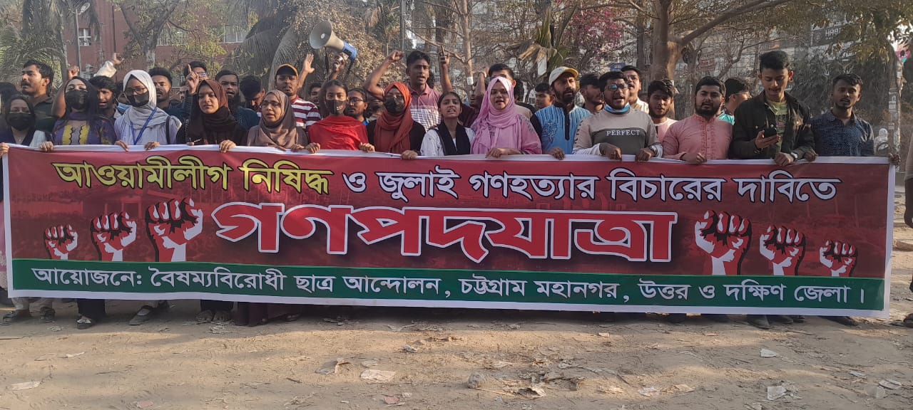 বৈষম্যবিরোধী ছাত্র আন্দোলনের সহযোদ্ধা দাবি করেন আওয়ামীলীগ ফ্যাসিবাদী যে দলটি আছে এটা নিষিদ্ধ না হওয়া পর্যন্ত এই আন্দোলন বন্ধ হবে না। তারিপেক্ষিতে বৈষম্যেবিরোধী ছাত্র আন্দোলনের চট্টগ্রামের নবগঠিত কমিটি চট্টগ্রাম মহানগর চট্টগ্রাম দক্ষিণ জেলা চট্টগ্রাম উত্তর জেলা যারা সহযোদ্ধা আছে সবাই একত্রিত হয়ে আওয়ামীলীগ নিষিদ্ধ এবং জুলাই গণহত্যা বিচারের দাবি সে দাবি নিয়ে আজকে আমরা রাজপথে এসেছি এবং এই মাধ্যমে আমাদের যে শহীদ ভাইদের যে রক্ত সে রক্তের দায় এবং আমাদের আহত ভাইদের যে দায় রাষ্ট্রের কাঁধে নিয়ে রাষ্ট্র সর্বোচ্চ বিচার বাস্তবায়ন করবে এটাই আমাদের প্রত্যাশা।