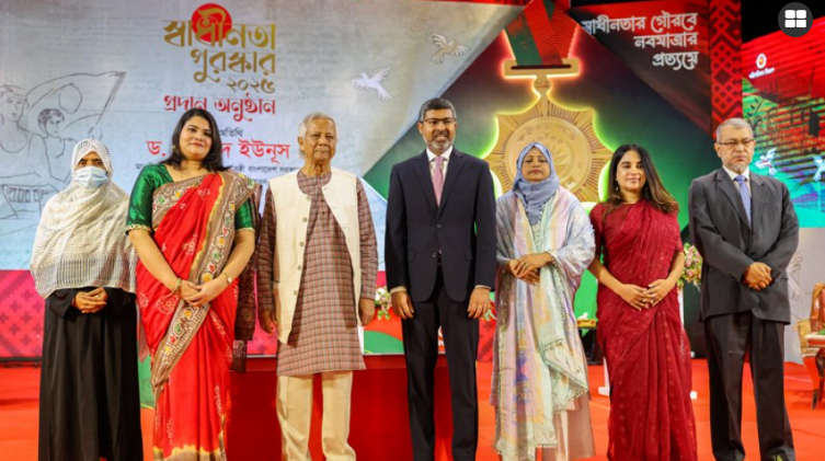 জাতীয় পর্যায়ে গৌরবোজ্জ্বল ও কৃতিত্বপূর্ণ অবদানের স্বীকৃতি হিসেবে সাত জনকে স্বাধীনতা পুরস্কার-২০২৫ তুলে দিলেন প্রধান উপদেষ্টা ড. মুহাম্মদ ইউনূস।