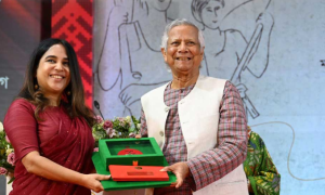 পুরস্কার প্রদান করে ড. ইউনূস বলেন, স্বাধীন বাংলাদেশে এখনো ন্যায়ভিত্তিক সমাজ প্রতিষ্ঠা করা সম্ভব হয়নি। ফ্যাসিবাদী সরকার দীর্ঘদিন ধরে এদেশের মানুষকে ভোটাধিকার থেকে বঞ্চিত করেছে।