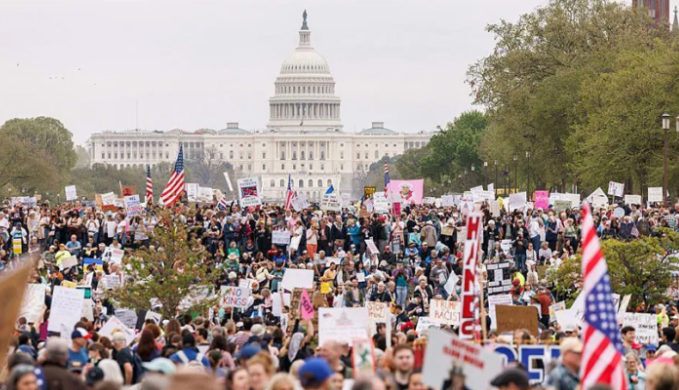 যুক্তরাষ্ট্রের প্রেসিডেন্ট ডোনাল্ড ট্রাম্প ও তার উপদেষ্টা ইলন মাস্কের বিরুদ্ধে যুক্তরাষ্ট্রের রাজধানী ওয়াশিংটন ডিসিসহ বিভিন্ন শহরে হাজার হাজার বিক্ষোভকারী বড় ধরনের বিক্ষোভ করেছেন। শনিবার (৫ এপ্রিল) দেশটির ৫০টি অঙ্গরাজ্যে প্রায় ১ হাজার ২০০ বিক্ষোভ সমাবেশ হয়। ট্রাম্প ক্ষমতা গ্রহণের পর যুক্তরাষ্ট্রের কেন্দ্রীয় সরকারের ব্যাপক হারে কর্মী ছাঁটাই এবং প্রেসিডেন্টের নির্বাহী ক্ষমতার যথেচ্ছ ব্যবহারের অভিযোগসহ বিভিন্ন ঘটনার পরিপ্রেক্ষিতে বিক্ষোভে নামেন মার্কিনীরা।