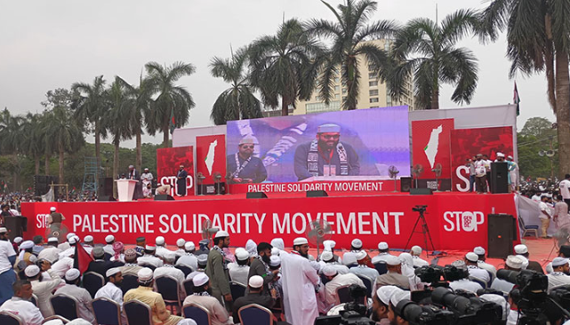 শনিবার (১২ এপ্রিল) বিকেল ৩টায় কোরআন তেলাওয়াতের মাধ্যমে মূল কর্মসূচি শুরু হয়। তবে সকাল থেকেই ঢাকার বিভিন্ন পয়েন্ট থেকে খণ্ড খণ্ড মিছিল নিয়ে সোহরাওয়ার্দী উদ্যানে আসতে থাকেন লোকজন। এসময় তাদের হাতে বাংলাদেশ ও ফিলিস্তিনি পতাকা দেখা গেছে।