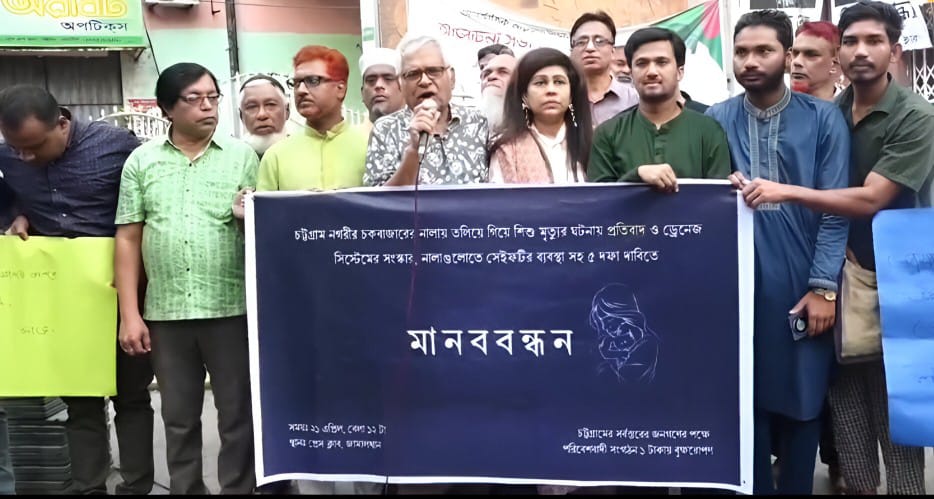 ২১ এপ্রিল (সোমবার) চট্টগ্রাম প্রেসক্লাব চত্ত্বরে চট্টগ্রাম নগরীর চকবাজারে নালায় তলিয়ে শিশু মৃত্যুর ঘটনায় প্রতিবাদ, ড্রেনেজ সিস্টেমের সংস্কার ও নিরাপত্তা নিশ্চিতসহ ৫ দফা দাবিতে অনুষ্ঠিত মানববন্ধনে তিনি এ মন্তব্য করেন।