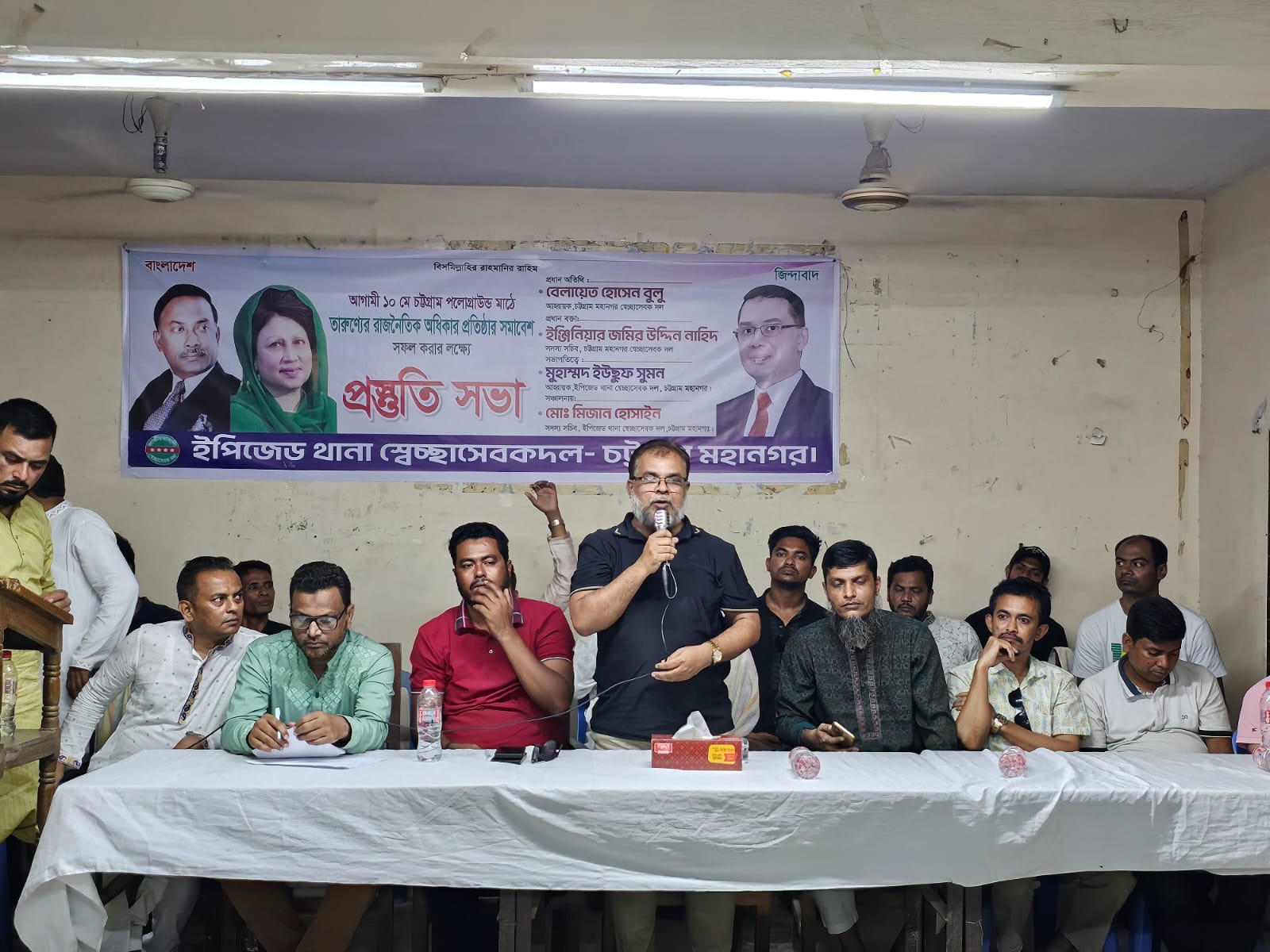 ইপিজেড থানা স্বেচ্ছাসেবক দলের আহ্বায়ক ইউসুফ সুমন এর সভাপতিত্বে ও সদস্য সচিব মোঃ মিজান হোসাইন এর সঞ্চালনায় প্রস্তুতি সভায় প্রধান বক্তার বক্তব্যে চট্টগ্রাম মহানগর স্বেচ্ছাসেবক দলের সদস্য সচিব ইঞ্জিনিয়ার জমির উদ্দিন নাহিদ বলেন, ফ্যাসিস্ট আওয়ামী সরকার জনগণের ভোটের অধিকার, মতপ্রকাশের অধিকার সহ সকল গণতান্ত্রিক অধিকার হরণ করেছিল। পর পর তিনটি নির্বাচনে মানুষ ভোট দিতে পারেনি। তারা ভোট দেওয়ার জন্য উন্মুখ হয়ে আছে। তাই অন্তর্বর্তীকালীন সরকার যদি অতীস্বত্তর নির্বাচনের রোডম্যাপ ঘোষণা না করে, ভোটের অধিকার প্রতিষ্ঠায় আমরা আন্দোলনে নামবো।