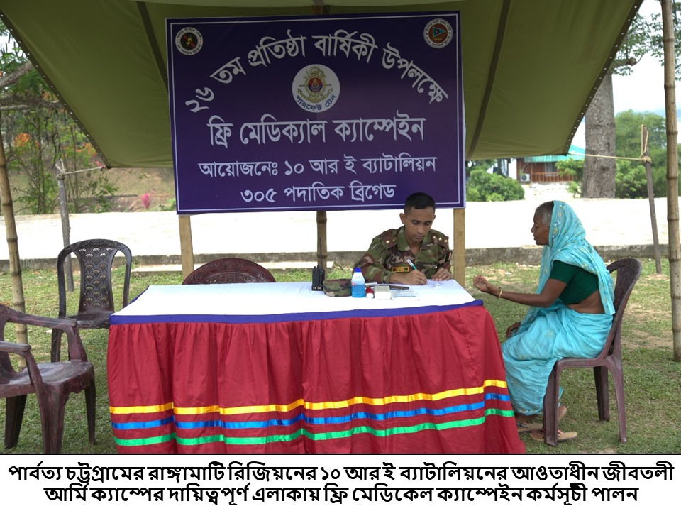 রাঙামাটি সেনা রিজিয়নের ১০আর ই ব্যাটালিয়নের ২৬তম প্রতিষ্ঠাবার্ষিকী উপলক্ষে বিনামূল্যে চিকিৎসা দেয়া হয়েছে।