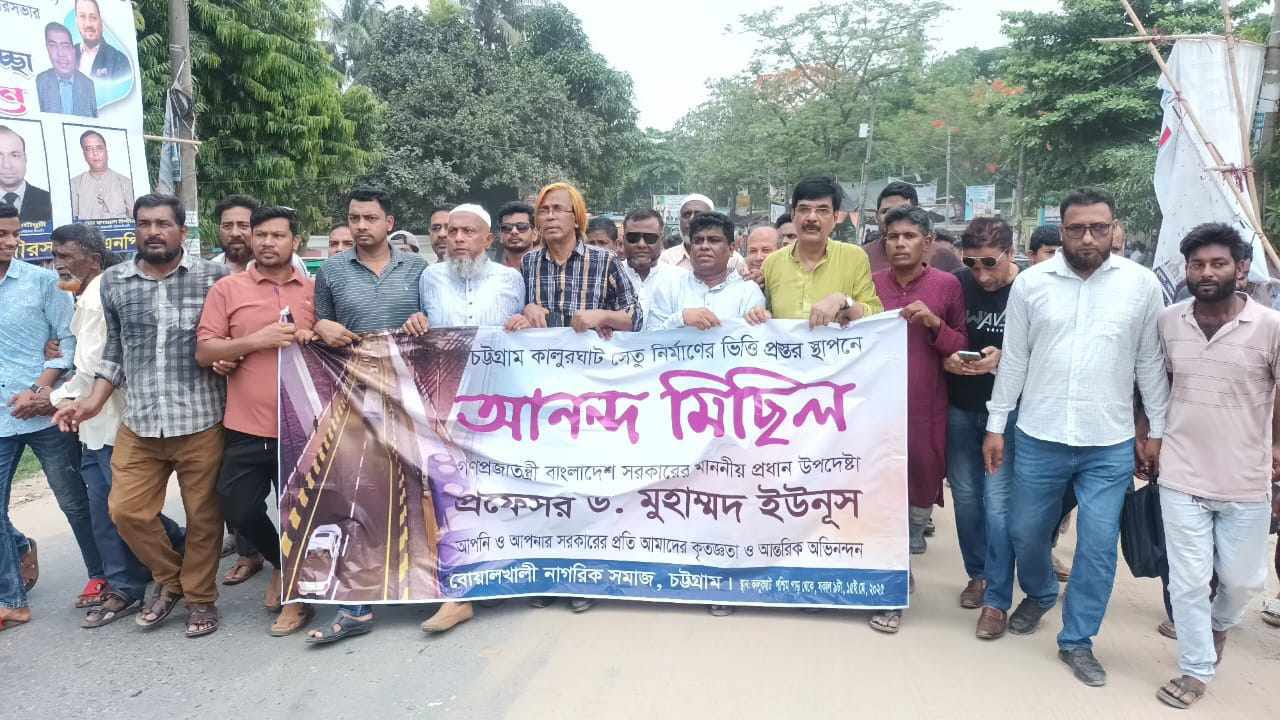 কালুরঘাট সেতু নির্মাণের ভিত্তি স্থাপনের পর দিন বৃহস্পতিবার (১৫ মে) সকালে বোয়ালখালী কালুরঘাট সেতু বাস্তবায়ন পরিষদ ও বোয়ালখালী নাগরিক সমাজ আনন্দ মিছিলের আয়োজন করে।
