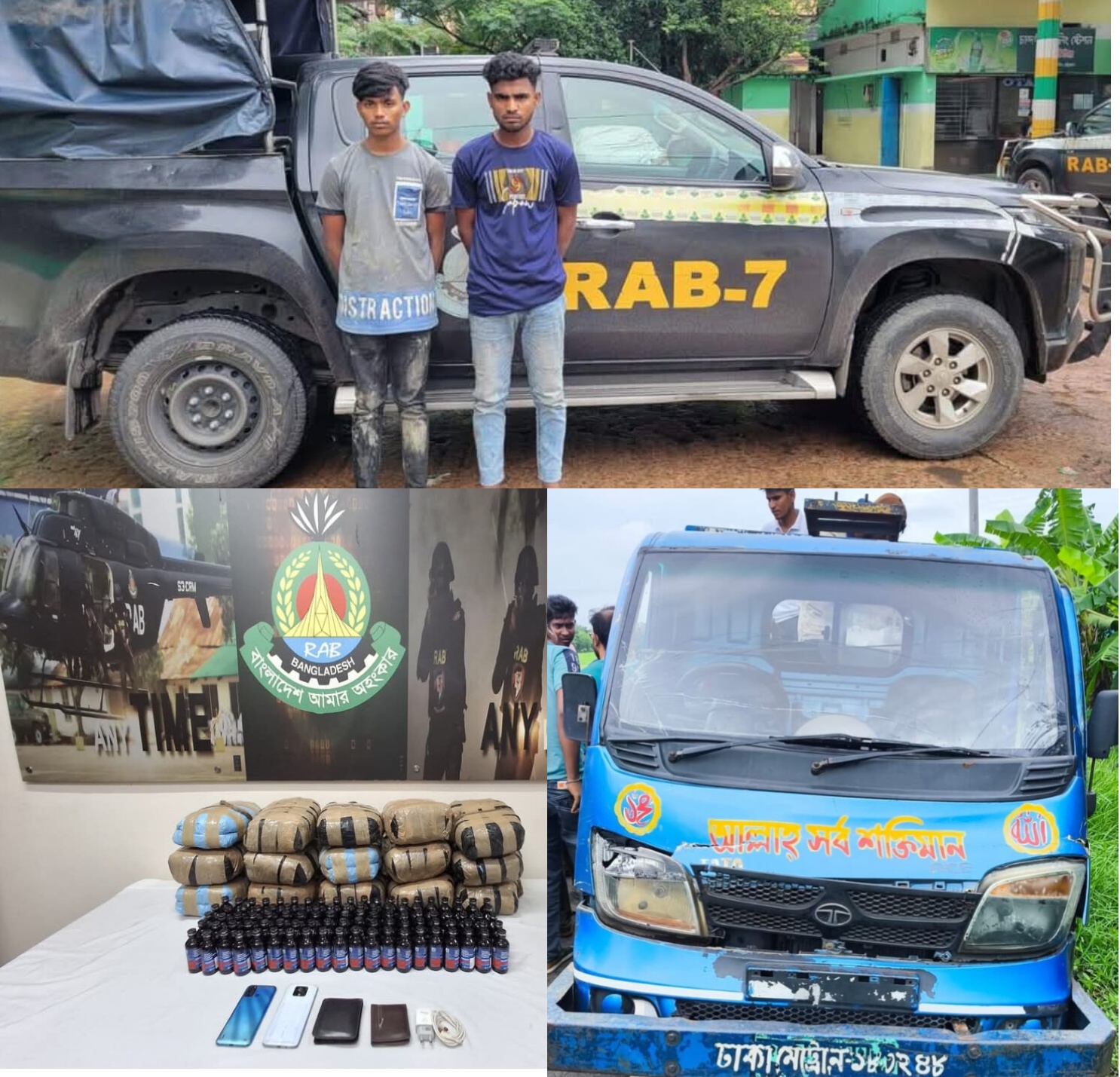 পরবর্তীতে তাদেরকে প্রাথমিক জিজ্ঞাসাবাদ করলে পিকআপের ভিতর মাদক আছে বলে স্বীকার করে। উপস্থিত র্যাব সদস্যরা পিকআপটি তল্লাশিকালে একটি নীল রঙ্গের ত্রিপল দিয়ে মোড়ানো দুটি বস্তার ভিতর ১০০ টি ফেনসিডিল বোতল এবং তিনটি নীল ও ১২টি কালো রঙ্গের পলিথিন থেকে ৩০ কেজি গাঁজাসহ তাদের গ্রেপ্তার করা হয়।