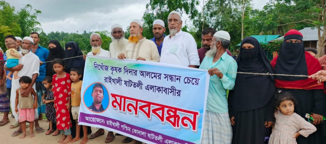 মানববন্ধনে ছাবের আহমদ, আবুল হাসান মেম্বার ও নিখোঁজ দিদার আলমের স্ত্রী কোহিনুর আক্তার বক্তব্যে বলেন, গত ১ মাস ৩ দিন ধরে দিদার নিখোঁজ, এটি শুধু তার পরিবারের নয়, আমাদের সমাজের উদ্বেগের বিষয়।