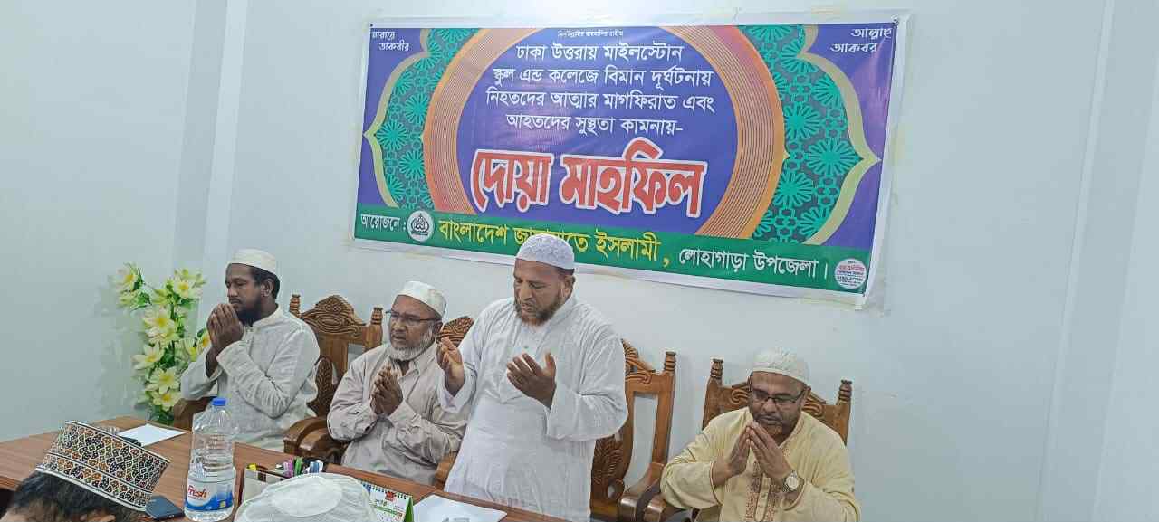 দোয়া মাহফিলে বক্তারা বলেন, উত্তরা মাইলস্টোন স্কুল এন্ড কলেজে মর্মান্তিক বিমান দুর্ঘটনায় নিহতদের রুহের মাগফিরাত কামনা করছি এবং আহতদের সুস্থতা কামনা করছি। আল্লাহ আমাদের এই রকম মর্মান্তিক মৃত্যু থেকে হেফাজত করুন। নিহত যারা হয়েছেন তাদের পরিবারের স্বজনদের ধৈর্য্য ধারণ করার তাওফীক দান করুন।