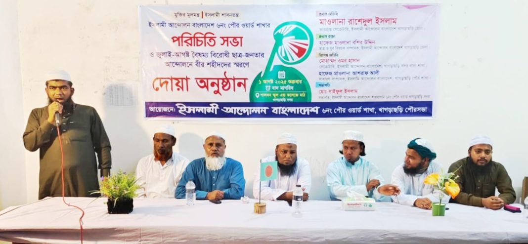 খাগড়াছড়ি পৌরসভার ৬ নং ওয়ার্ড শালবন ইসলামী আন্দোলন বাংলাদেশ পরিচিতি সভা ও জুলাই শহীদদের স্মরণে দোয়া অনুষ্টিত শুক্রবার (১ আগষ্ট) সন্ধ্যায় অনুষ্ঠিত হয়েছে।
