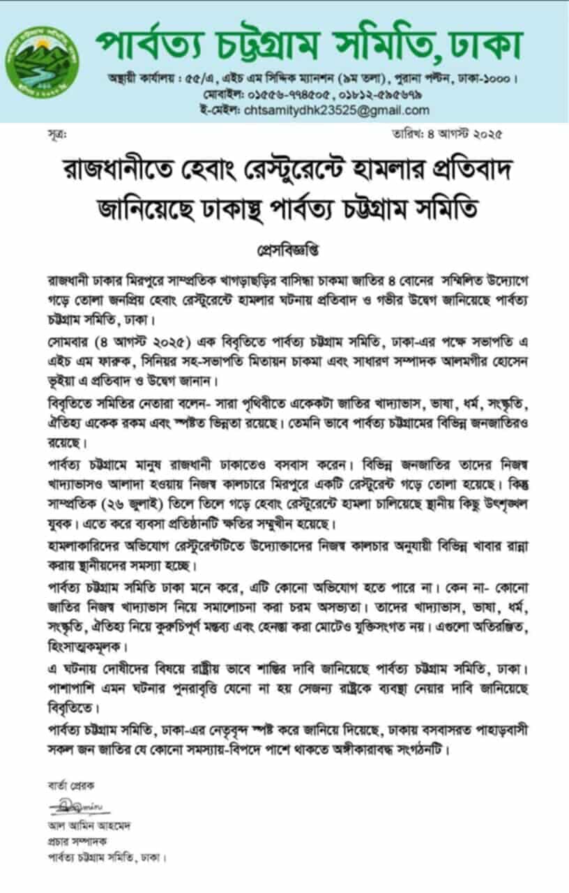 হেবাং রেস্টুরেন্টে হামলার প্রতিবাদ জানিয়েছে ঢাকাস্থ পার্বত্য চট্টগ্রাম সমিতি