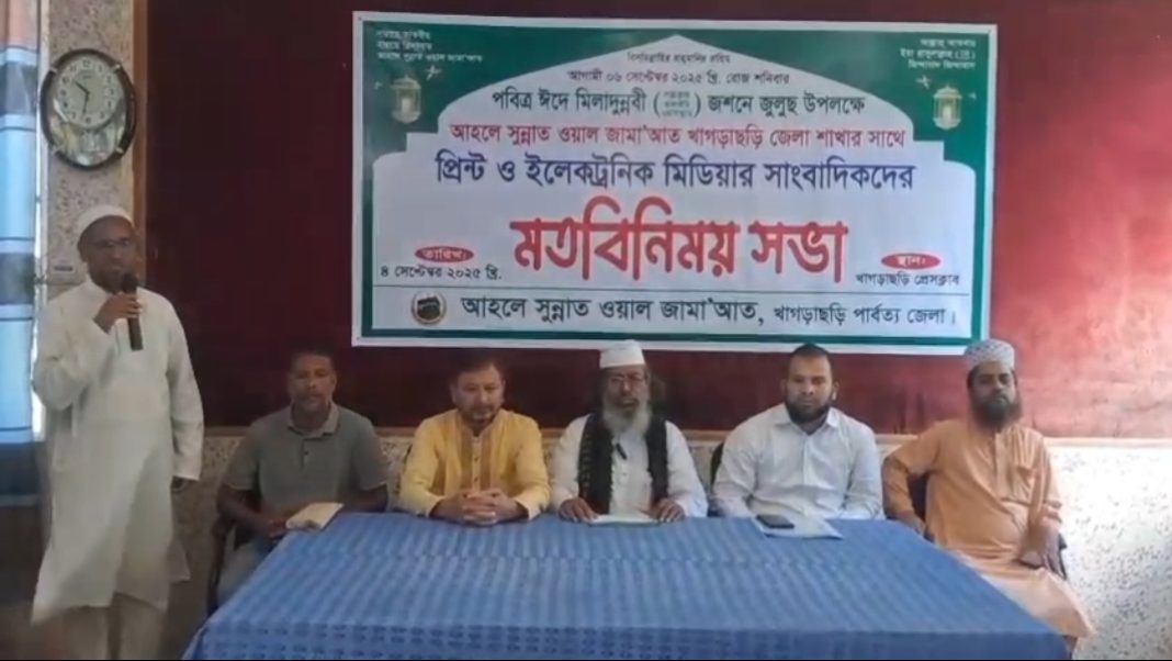 আজ বৃহস্পতিবার (৪ সেপ্টেম্বর) সকালে খাগড়াছড়ি প্রেসক্লাবে আহলে সুন্নাত ওয়াল জামাআত এর নেতৃবৃন্দ জেলায় গণমাধ্যম কর্মীদের সাথে এ মতবিনিময় সভা করেন।