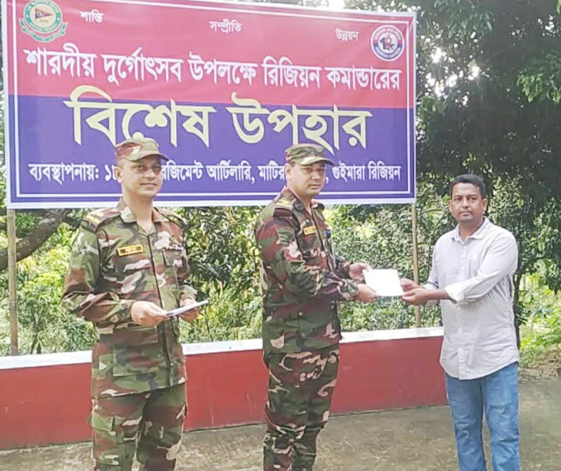 সনাতন সম্প্রদায়ের সর্বোচ্চ ধর্মীয় উৎসব “শারদীয় দুর্গোৎসব” উপলক্ষ্যে বাংলাদেশ সেনাবাহিনীর গুইমারা রিজিয়ন কমান্ডারের পক্ষ হতে মাটিরাঙ্গা উপজেলার ছয়টি পূজা মন্ডপে শুভেচ্ছা উপহার প্রদান করা হয়েছে।