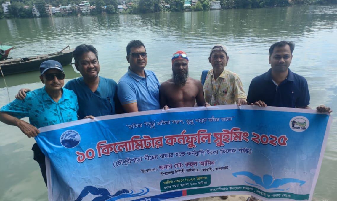 রাঙামাটির কাপ্তাই কর্ণফুলী নদীতে বেংগল ডলফিনের আয়োজনে আটজন সাঁতার ৪ঘন্টা ২৫মিনিট সাঁতার প্রতিযোগিতা অনুষ্ঠিত হয়েছে । শুক্রবার (৩সেপ্টেম্বর) কাপ্তাই উপজেলা প্রশাসনের সহযোগিতা সকাল ৭টায় কর্ণফুলী নদীর কাপ্তাই কার্গো ডাউন সাইড এলাকা হতে চন্দ্রঘোনা মিশন ঘাট পযন্ত আট সাঁতার ১০কিঃমিঃ সুইমিং সমাপ্তি করে। সাঁতারদের প্রতিপাদ্য বিষয় ছিলো ‘সাঁতার শিখুন সাতাঁর করুন সুস্থ থাকুন জীবন বাঁচান’। অনুষ্ঠানের উদ্বোধন করে কাপ্তাই উপজেলা নির্বাহী অফিসার মো রুহুল আমিন। আট সাঁতারু সাঁতার শেষে ফুল দিয়ে গ্রহণ করে কাপ্তাই উপজেলা পরিষদ সাবেক চেয়ারম্যান দিলদার, কাপ্তাই উচ্চ বিদ্যালয়ের স্কাউট কমিশনার মাহাবুব হাসান, মিশন হাসপাতাল ডাক্তার বিলিয়ন সংমা, উপজেলা ক্রীড়া সদস্য কাজী মোশাররফ হোসেন ও ছাত্র নেতা মো. ইব্রাহিম প্রমুখ। প্রথম সাঁতারু এ এস এম ফেরদৌসসহ এসময় সকল সাঁতারুদের দেখতে নদীর দু’পাশ জুড়ে শত,শত উৎসহ জনতা ভিড় জমে।