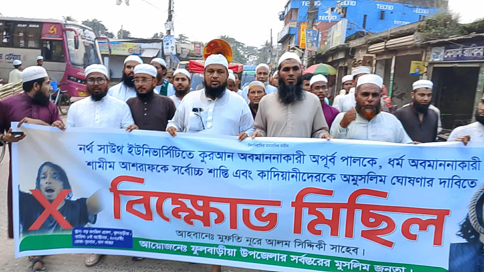 নর্থসাউথ বিশ্ববিদ্যালয়ের শিক্ষার্থী অপূর্ব পাল কতৃক পবিত্র কোরআন শরিফ অবমাননার প্রতিবাদ এবং অবমাননাকারীর দৃষ্টান্তমূলক শাস্তির দাবিতে ফুলবাড়ীয়া উপজেলার সর্বস্তরের মুসলিম জনতার ব্যানারে বিক্ষোভ মিছিল ও সমাবেশ অনুষ্ঠিত হয়েছে।