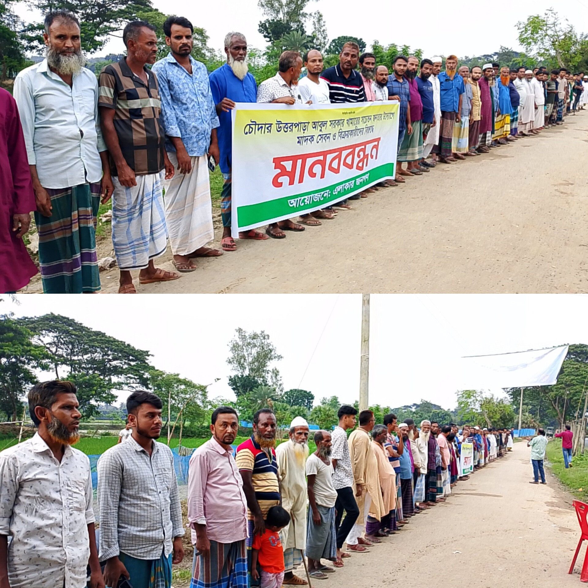 শুক্রবার(১০ অক্টোবর) বিকেলে চৌদার উত্তরপাড়া আবুল সরকারের খামার এলাকার আন্ধারিয়াপাড়া রোডে মানববন্ধন অনুষ্ঠিত হয়। সমাজসেবক ও শিক্ষক মোজাম্মেল হক পরিচালনায় এতে বক্তব্য রাখেন, ফুলবাড়ীয়া ইউনিয়ন যুবদলের সভাপতি আবু বকর সিদ্দিক, ইউপি সদস্য আনোয়ার হোসেন, পল্লী সঞ্চয় ব্যাংকের ম্যানেজার মোহাম্মদ শাহজাহান, উপজেলা মৎস্যজীবী দলের আহ্বায়ক আবু ইউসুফ, সদস্য সচিব ইমরান হোসেন সবুজ, সমাজ সেবক ডাঃ আবু হানিফা ও মোশাররফ হোসেন প্রমুখ।