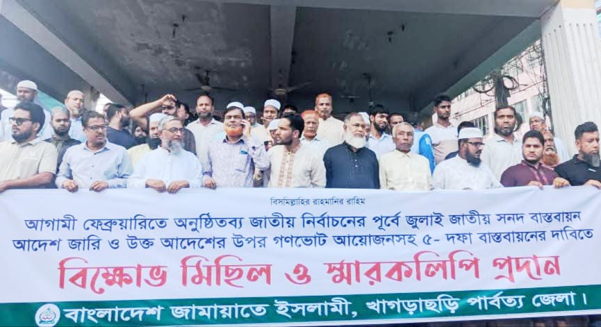 জাতীয় সংসদ নির্বাচনের আগে জুলাই সনদের আদেশ ও বাস্তবায়নের উপর ভিত্তি করে গণভোট আয়োজন, সংসদের উভয় কক্ষে পিআর পদ্ধতি চালুসহ পাঁচ দফা বাস্তবায়নের দাবিতে প্রধান উপদেষ্টা বরাবরে জেলা প্রশাসকের মাধ্যমে স্মারকলিপি দিয়েছে বাংলাদেশ জামায়াতে ইসলামী খাগড়াছড়ি জেলা কমিটি। আজ রোববার দুপুর ১২টার দিকে এ কর্মসূচি পালিত হয়।