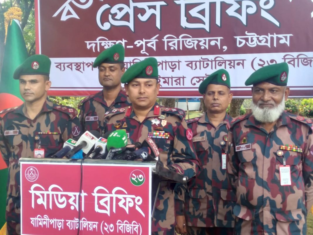 আজ বৃহস্পতিবার (২৩ অক্টোবর) চট্টগ্রাম রিজিয়নের আওতাধীন খাগড়াছড়ি জেলার যামিনী পাড়া বর্ডার গার্ড বাংলাদেশ ২৩ বিজিবি ব্যাটালিয়ন সদর দফতরে আয়োজিত এক সংবাদ সম্মেলনে এসব তথ্য জানান ব্যাটালিয়নের অধিনায়ক লেঃ কর্নেল খালেদ ইবনে হোসেন।
