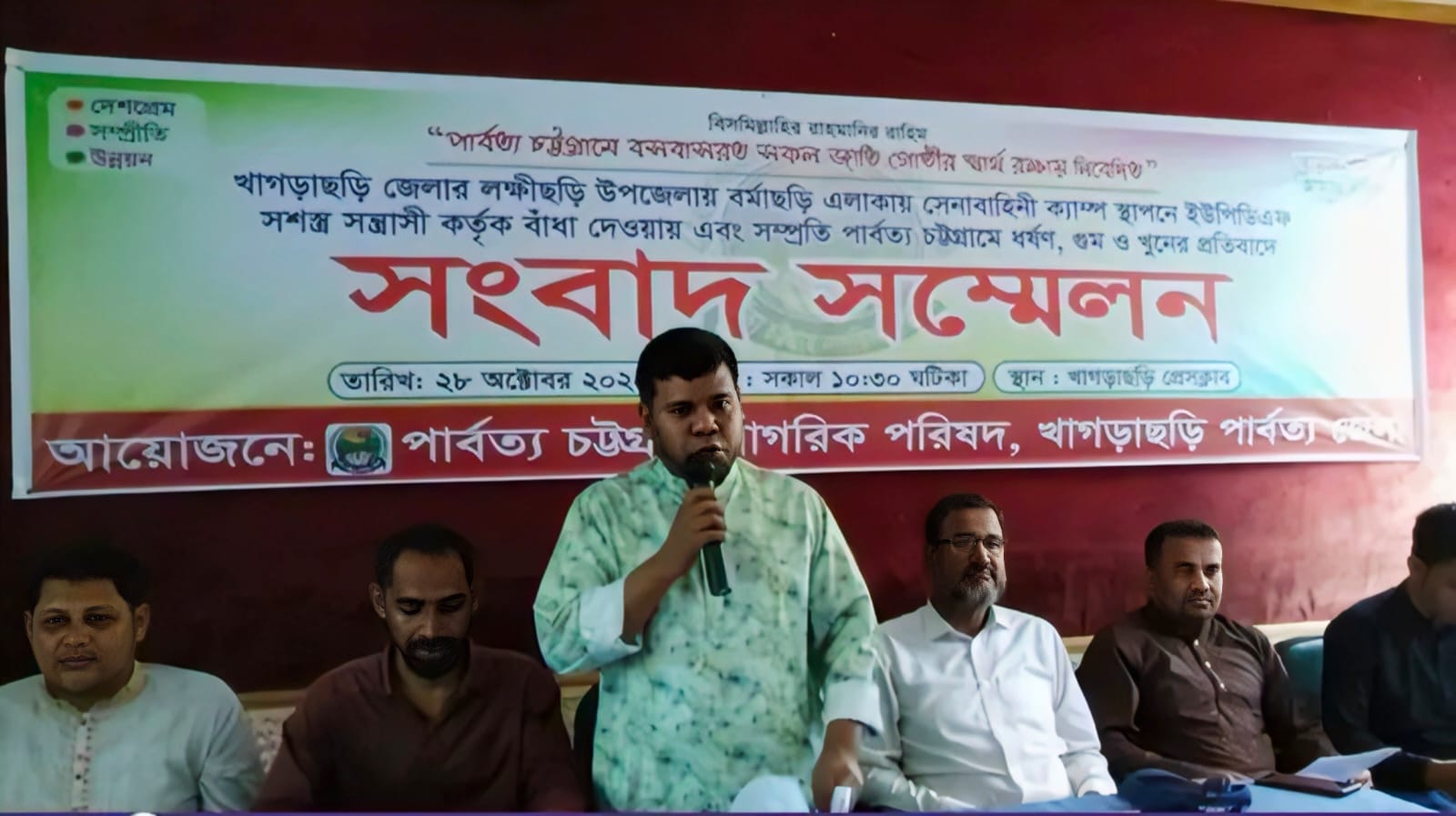 খাগড়াছড়ির লক্ষ্মীছড়ি উপজেলার বর্মাছড়ি এলাকায় বাংলাদেশ সেনাবাহিনীর ক্যাম্প স্থাপনে ইউপিডিএফের বাধা এবং সাম্প্রতিক সময়ে পার্বত্য চট্টগ্রামে ঘটে যাওয়া ধর্ষণ, গুম ও খুনের ঘটনাবলীর প্রতিবাদে সংবাদ সম্মেলন করেছে পার্বত্য চট্টগ্রাম নাগরিক পরিষদ।