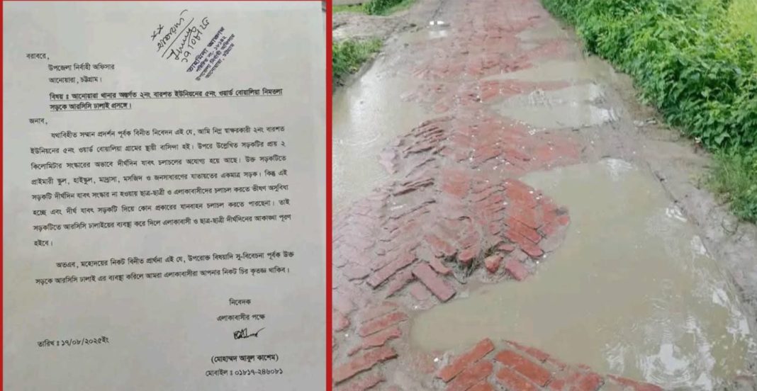 আবেদনে উল্লেখ করা হয়, আনোয়ারা থানার অন্তর্গত ২নং বারশত ইউনিয়ন এর বোয়ালিয়া হয়ে জাগির পাড়া নতুন মাদ্রসা ও বারশত এর প্রধান সড়ক সংযোগ সড়কটি দীর্ঘদিন ধরে জরাজীর্ণ অবস্থায় রয়েছে। সড়কটি দিয়ে স্থানীয় জনগণ, স্কুল-কলেজের শিক্ষার্থী ও রোগীরা প্রতিদিন চলাচল করে থাকেন। কিন্তু সড়কের ভগ্নদশার কারণে যানবাহন চলাচল কঠিন হয়ে পড়েছে এবং প্রতিনিয়ত দুর্ঘটনা ঘটছে।