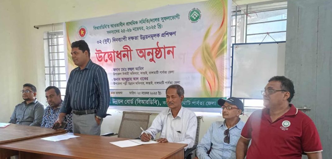 রাঙামাটির কাপ্তাই দুইদিন ব্যাপী দক্ষতা উন্নয়নমূলক প্রশিক্ষণ পল্লী উন্নয়ন কার্যালয়ে উদ্বোধন করা হয়েছে। মঙ্গলবার (২৫ নভেম্বর) বিআরডিবি মিলনায়তনে সমবায় সমিতি দলের উপকারভোগী সদস্যদের নিয়ে এই প্রশিক্ষণ অনুষ্ঠিত হয়।