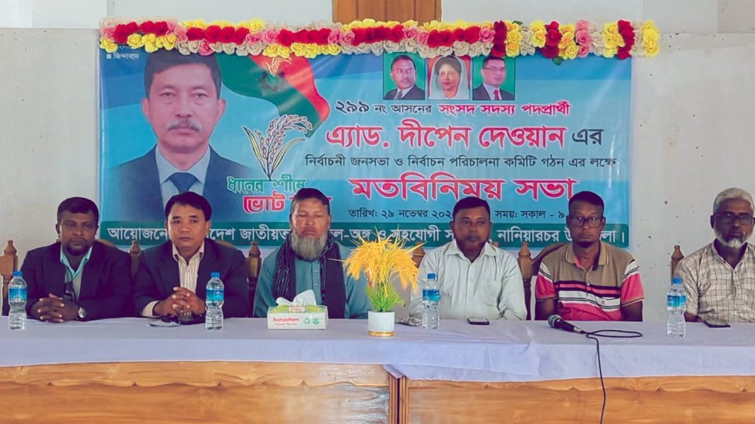 ২৯৯ নং সংসদীয় আসনে বাংলাদেশ জাতীয়তাবাদী দল বিএনপি মনোনীত পদপ্রার্থী জননেতা এ্যাডভোকেট দীপেন দেওয়ান এর নির্বাচনী জনসভা ও নির্বাচন পরিচালনা কমিটি গঠনের লক্ষ্যে নানিয়ারচর উপজেলা বিএনপির উদ্যোগে এক মতবিনিময় সভা অনুষ্ঠিত হয়।