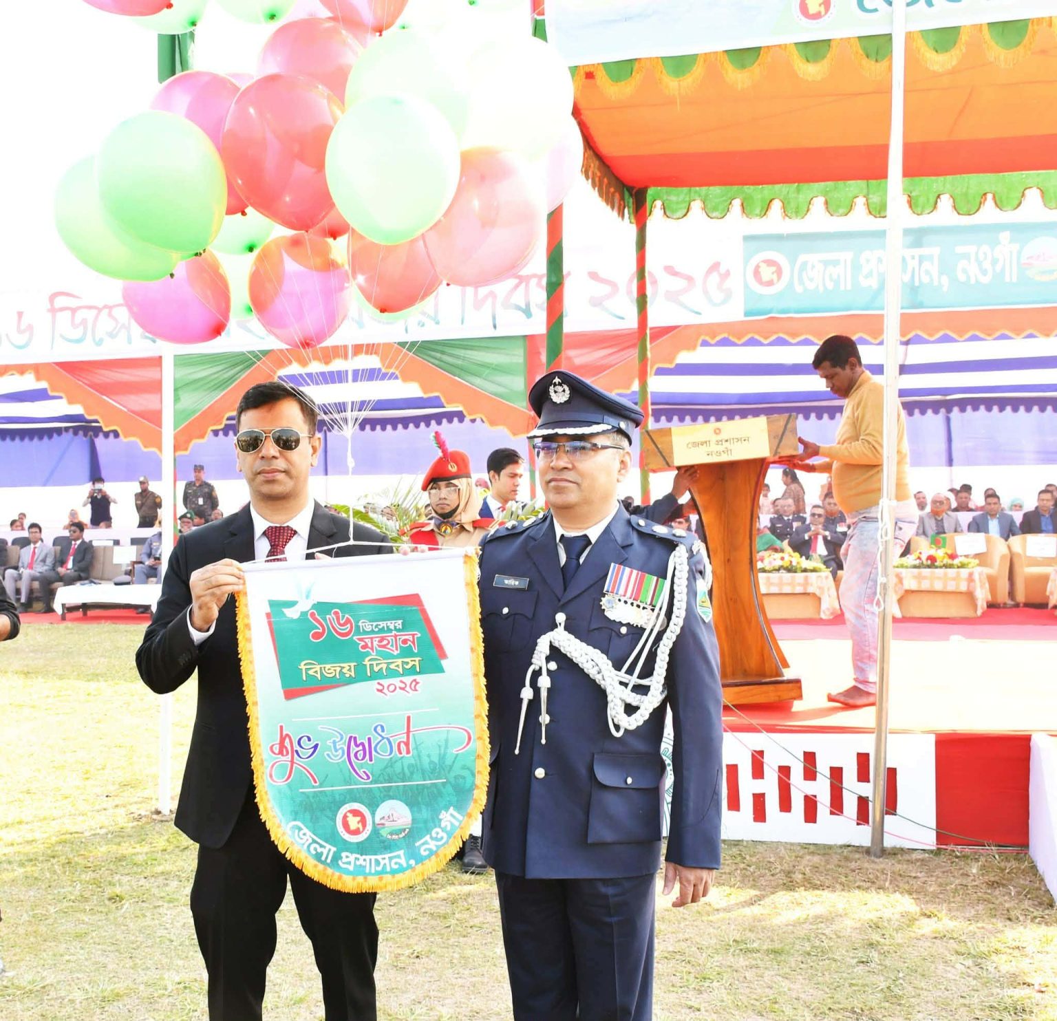 (১৬ ডিসেম্বর মঙ্গলবার ) সকাল থেকে নওগাঁ জেলা স্টেডিয়াম উৎসবমুখর পরিবেশে সাজানো হয়। জেলা পুলিশ, আনসার ও ভিডিপি, ফায়ার সার্ভিস, বিএনসিসি, স্কাউটস, গার্ল গাইডস এবং বিভিন্ন শিক্ষা প্রতিষ্ঠানের শিক্ষার্থীরা সুসংগঠিতভাবে প্যারেড ও কুচকাওয়াজে অংশগ্রহণ করে।