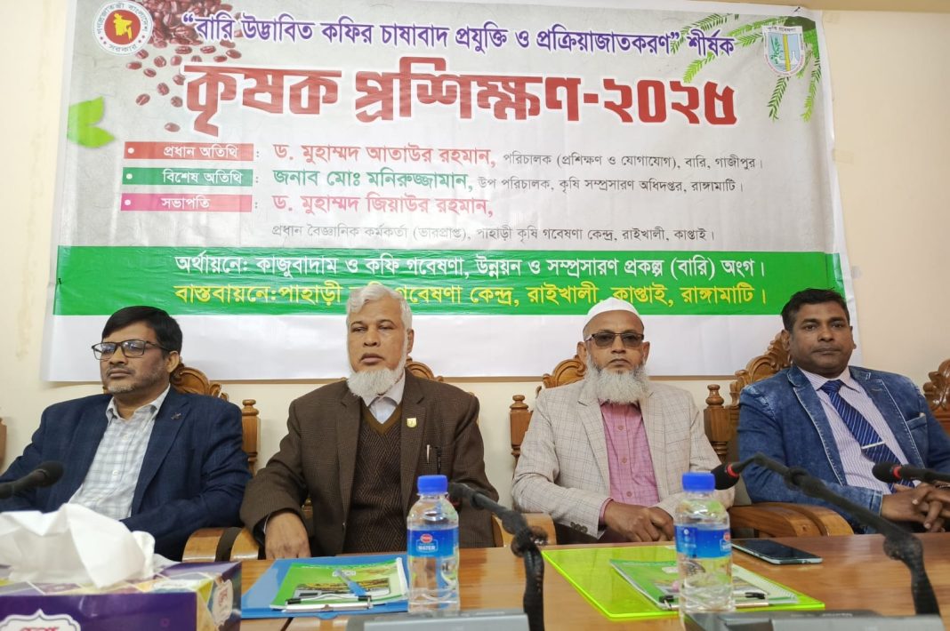 রাঙামাটি কাপ্তাই রাইখালী কৃষি গবেষণা কেন্দ্রে “বারি উদ্ভাবিত কফির চাষাবাদ প্রযুক্তি ও প্রক্রিয়াজাতকরণ” শীর্ষক কৃষক প্রশিক্ষণ অনুষ্ঠিত হয়েছে। বুধবার সকাল ১০টায় কৃষি গবেষণা কেন্দ্রে কাজুবাদাম ও কফি গবেষণা, উন্নয়ন ও সম্প্রসারণ প্রকল্প (বারি)অংগ এর অর্থায়নে এবং পাহাড়ী কৃষি গবেষণা কেন্দ্র রাইখালী, কাপ্তাইয়ের বাস্তবায়নে প্রশিক্ষণ অনুষ্ঠিত হয়। রাইখালী কৃষি গবেষণা কেন্দ্র বৈজ্ঞানিক কর্মকর্তা মাহামুদুল হাসান এর সঞ্চালনায় এতে সভাপতিত্ব করে প্রধান বৈজ্ঞানিক কর্মকর্তা ড.জিয়াউর রহমান (ভারপ্রাপ্ত)পাহাড়ী কৃষি গবেষণা কেন্দ্র রাইখালী, কাপ্তাই। প্রধান অতিথি উপস্থিত থেকে বক্তব্য রাখেন ড.মুহাম্মদ আতাউর রহমান, পরিচালক (প্রশিক্ষণ ও যোগাযোগ), বারি গাজীপুর, তিনি কৃষকদের উদ্দেশ্যে বলেন, এরাবিয়ান এবং রোবাস্ট জাতের কফি চাষে যেমন সফলতা পাওয়া যায়, তেমনি এই জাতের কফি চাষে কৃষকদের সচেতন হবে
