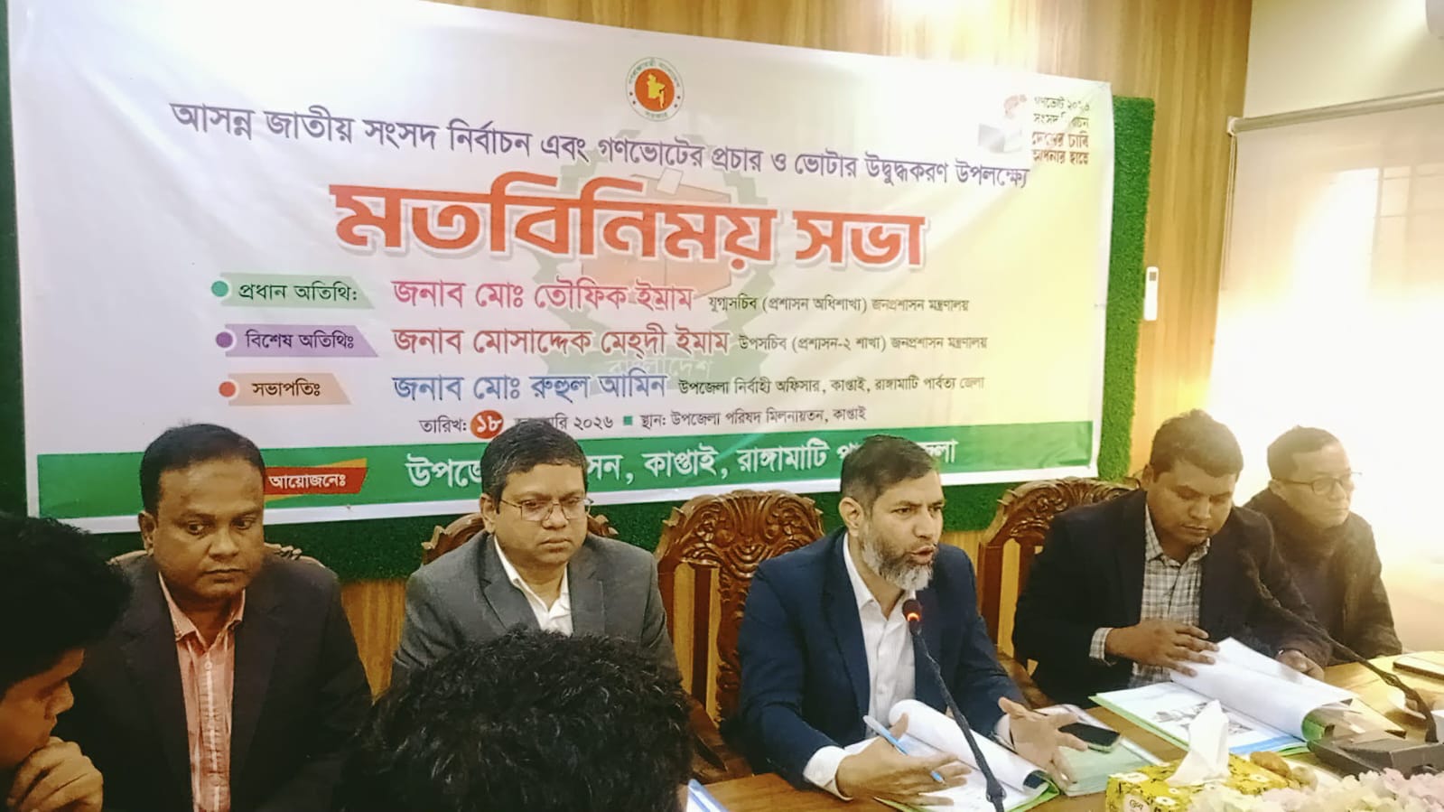 ত্রয়োদশ জাতীয় সংসদ নির্বাচন ও গণভোট-২০২৬ এর ভোটারদের ভোটদানে উদ্বুদ্ধকরণের লক্ষ্যে রাঙামাটির কাপ্তাইয়ে অংশীজনদের নিয়ে মতবিনিময় সভা অনুষ্ঠিত হয়েছে।