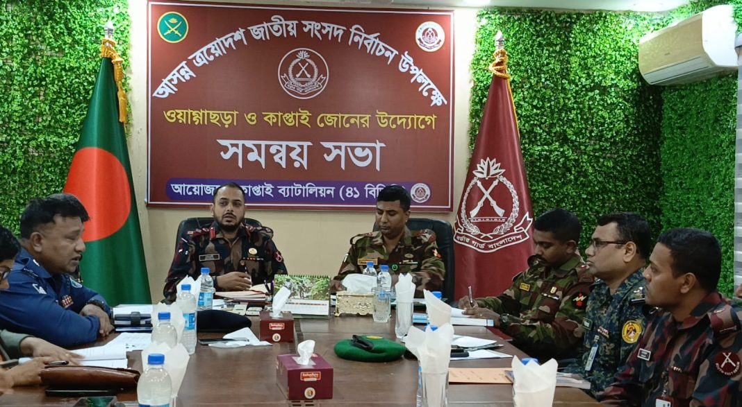 আসন্ন ত্রয়োদশ জাতীয় সংসদ নির্বাচন ও গণভোট২৬ উপলক্ষে কাপ্তাই ব্যাটালিয়ন(৪১বিজিবি) ও কাপ্তাই জোনের উদ্যোগে কনফারেন্স রুমে সমন্বয় সভা হয়েছে। মঙ্গলবার সকাল সাড়ে ১১ টায় বিজিবি ওয়াগ্গাছড়া জোনের আয়োজনে এ সমন্বয় সভা অনুষ্ঠিত হয়। সমন্বয় সভায় সভাপতিত্ব করে কাপ্তাই ব্যাটালিয়নের(৪১ বিজিবি) অধিনায়ক লেঃকর্ণেল কাওসার মেহেদী সিগন্যালস্।অধিনায়ক বলেন আসন্ন ত্রয়োদশ জাতীয় সংসদ নির্বাচন ও গণভোট সুষ্ঠ ও নিরপেক্ষ দায়িত্ব পালনে বিজিবিসহ সকল আইনশৃঙ্খলা বাহিনী কঠোর নিরপেক্ষ ভাবে দায়িত্ব পালন করবে। এসময় বক্তব্য রাখেন অধিনায়ক রনজয়ী ৩৮বীর এর কাপ্তাই জোন কমান্ডার লেঃকর্ণেল মুহাম্মদ নাজমুল কাদির শুভ পিএসসি। তিনি জানান,আসন্ন ত্রয়োদশ জাতীয় সংসদ নির্বাচন ও গণভোট সুষ্ঠ উপলক্ষে কাপ্তাই সেনাজোন এর দায়িত্বপূর্ণ এলাকায় টহল জোরদার করা হয়েছে। আগামি ১৪ফেব্রুয়ারি ২৬ইং তারিখ পযন্ত দায়িত্ব পালন করা হবে। বডি ক্যামেরা ব্যবহারসহ আইনশৃঙ্খলা বাহিনীর সমন্বয়ে সকল ধরনের নির্বাচনী কেন্দ্রগুলোতে নিরাপত্তার জন্য দায়িত্ব পালন করা হবে বলে জানান। এসময় আরও বক্তব্য রাখেন কাপ্তাই সার্কেল এর অতিরিক্ত পুলিশ সুপার মো.জাহেদুল ইসলাম, কাপ্তাই নির্বাহী অফিসারের প্রতিনিধি সহকারী ভূমি কমিশনা নেলি রুদ্র, কাপ্তাই উপজেলা নির্বাচন অফিসার মিতা পারিয়াল, ২৩,৩৫আনসার ব্যাটালিয়ন পরিচালক, ১০আর ই ব্যাটালিয়ন প্রতিনিধি,কাপ্তাই, চন্দ্রঘোনা থানা অফিসার ও মিডিয়া কর্মীবৃন্দ উপস্থিত থেকে মত প্রকাশ করা হয়।
