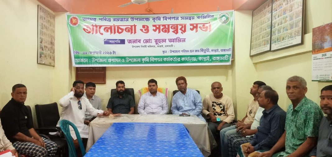 পবিত্র রমজান মাসে দ্রব্যমূল্য স্থিতিশীল রাখা বিষয়ে কাপ্তাই নতুন বাজার ব্যবসায়ীদের নিয়ে আলোচনা ও সমন্বয় সভা করেছে উপজেলা প্রশাসন । বৃহস্পতিবার বেলা সাড়ে ১২টায় কাপ্তাই নতুন বাজার বণিক কল্যান সমবায় সমিতি লিঃ কার্যালয়ে এ সভা অনুষ্ঠিত হয়। কাপ্তাই উপজেলা প্রশাসন ও কৃষি বিপনন কমিটির আয়োজনে নতুন বাজার ব্যবসায়ী ও কমিটির নেতৃবৃন্দ সাথে আলোচনা সভায় সভাপতিত্ব করে কাপ্তাই উপজেলা নির্বাহী অফিসার মো রুহুল আমিন। উপজেলা প্রশাসন সকল ব্যবসায়ীদের বলেন পবিত্র রমজান মাসে দ্রব্যমূল্য সহনীয় পর্যায়ে রাখতে ব্যবসায়ীদের অনুরোধ করে। এবং দ্রব্যমূল্য তালিকা,পাকা রশিদ,জিলাপি, বেগুনিতে রঙ না মিশানো,পোড়া,বাসি তেল ব্যবহার নিষেধসহ দ্রব্যমূল্য স্থিতিশীল রাখা উপর গুরত্বরোপ করা হয়। এসময় উপস্থিত ছিলেন কাপ্তাই উপজেলা তথ্য অফিসার মো দেলোয়ার হোসেন, কাপ্তাই উপজেলা বিএনপির সভাপতি মো লোকমান আহমেদ, কাপ্তাই কৃষি বিপনন কর্মকর্তা অভিজিৎ বড়ুয়া,কাপ্তাই নতুন বাজার সমিতির সভাপতি মো জয়নাল আবেদীন, সম্পাদক এম করিমসহ নতুন বাজার ব্যবসায়ীরা উপস্থিত ছিলেন।